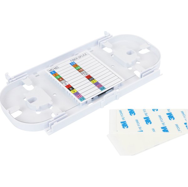 Comes complete with clear lid, label and self-adhesive pads for secure location. These splice cassettes are also stackable and clip together with a hinge to allow easy access to the lower cassettes.