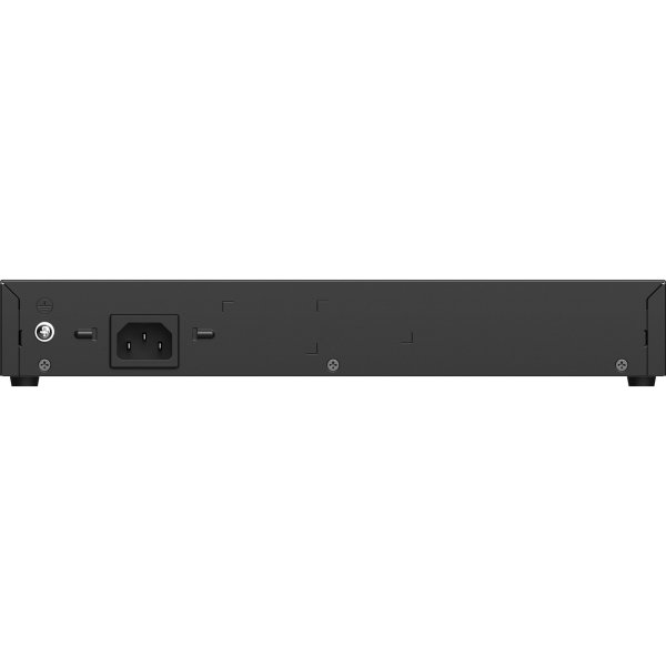 The RG-ES220GS-P switch provides 18 × 10/100/1000Base-T ports, 2 × gigabit SFP ports on the front panel, and an AC power connector on the back panel.